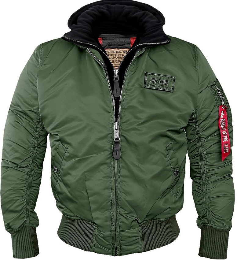 Zimní pánská letecká bunda "bomber" ALPHA INDUSTRIES MA-1 D-TEC se zapínáním na zip, 2 přední šikmé kapsy se zapínáním na druky, kapsička na tužky na levém rukávu, 2 vnitřní kapsy s druky. V levé části hrudníku velcro nášivka s logem ALPHA. Odepínatelná vložka s kapucí. Náplety v pase, na rukávech a límci bundy. Materiál: 100% nylon-vnější a podšívka, 100% polyester-zateplení, 80% bavlna, 20% polyester-kapuce. Doporučená údržba: chemické čištění.